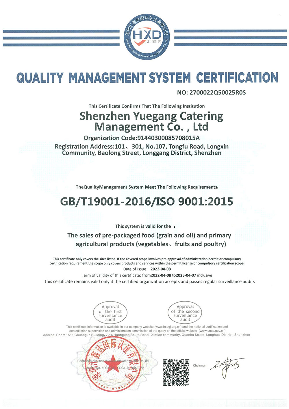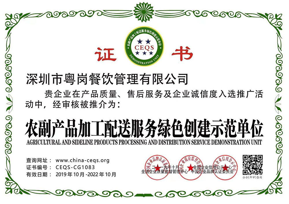 深圳市粵崗餐飲管理有限公司,是一家集蔬菜種植和農(nóng)副產(chǎn)品配送為一體的專業(yè)型餐飲公司,主要為學(xué)校、工廠企事業(yè)機關(guān)單位提供蔬菜和農(nóng)副產(chǎn)品配送服務(wù)。公司自成立以來始終以質(zhì)優(yōu)價廉、服務(wù)至上為原則,嚴(yán)格按照ISO:9001國際標(biāo)準(zhǔn)體系進行管理。同時建立了行業(yè)領(lǐng)先的配送中心、大型冷庫和保鮮庫、檢測中心以及專業(yè)化的配送團隊,能長期安全、穩(wěn)定、準(zhǔn)時的配送貨物。我們所有蔬菜均經(jīng)過初步加工、無黃葉,無泥沙等雜質(zhì),利用率達97%以上...保障向用戶提供的各類食材的衛(wèi)生和質(zhì)量。公司為了適應(yīng)不同客戶的需求,配有專業(yè)人員和配送車輛,實行“一對一”的服務(wù)體制,一心一意的為客戶服務(wù),秉承粵崗誠實守信、服務(wù)第一、客戶至上的服務(wù)標(biāo)準(zhǔn),真正讓客戶花最少的錢吃最好的菜。粵崗多年來何以欣欣向榮,因為我們知道只有勇于擔(dān)當(dāng)責(zé)任,才能承擔(dān)更大的責(zé)任,就是因為 粵崗員工貫徹公司態(tài)度決定一切、細(xì)節(jié)決定成敗的真理,從質(zhì)量抓起,從服務(wù)做起,才創(chuàng)造了如今的規(guī)模化供應(yīng)、統(tǒng)一性配送、專業(yè)化服務(wù)的粵崗。